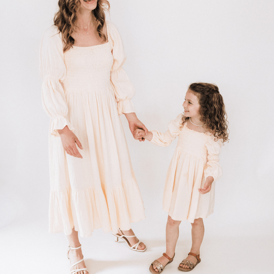 This is an add to cart favorite! Neutral mommy and me dresses in a unique muslin gauze material with elegant ruching around the bust and sleeves. The dress that flatters everyone and goes with everything. What's not to love?! Mama's dress is calf length with a shirred bust and flirty puffed sleeves. The matching girls dress is just an identical mini match. Baby girl's infant onesie has a pull-up design and the same fun puffy sleeves. These are a must have for your next family photoshoot.