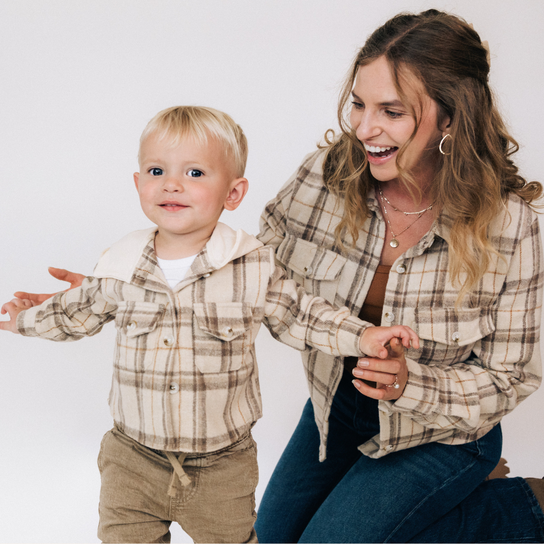 A plaid flannel you will wear again and again to match your little cutie. Nothing says cozy like these light beige mommy and me flannels. Get ready for comfort and style. These plaid flannels, available in a warm beige color, are perfect for any occasion and can be worn time and time again. Plus, with matching options for your little one, you can both stay cozy and coordinated.