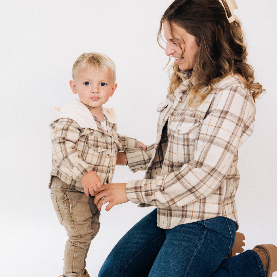 Women's- A plaid flannel you will wear again and again to match your little boy. Nothing says cozy like these light beige mommy and me flannels. Get ready for comfort and style. These plaid flannels, available in a warm beige color, are perfect for any occasion and can be worn time and time again. Plus, with matching options for your little one, you and your little man stay cozy and coordinated.