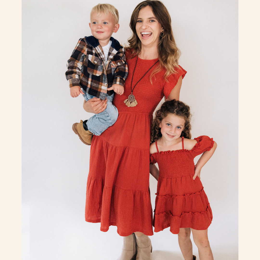 Matching mommy and me dresses that are sweet perfection for you and your little girl or baby. The knee-length dress boasts a shirred bust and back button enclosure, while the tiered skirt adds a playful touch. The stunning rusty copper red color is complemented by a beautiful boho necklace with tassels and adjustable rope cord, making it a complete and stylish outfit. The material is cotton crepe which is similar to muslin. After the first wash and tumble dry the material gets a soft and patterned texture. Fabric is 100% cotton.