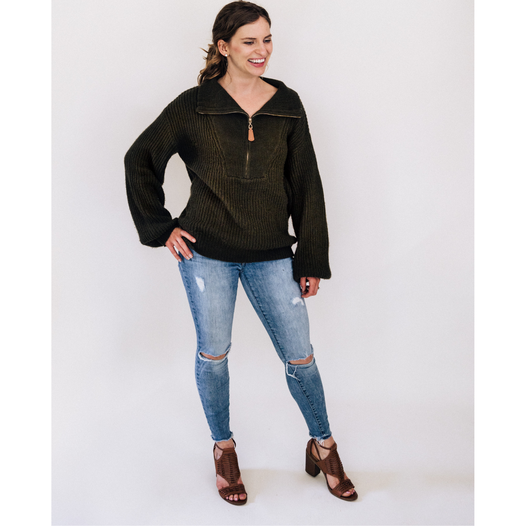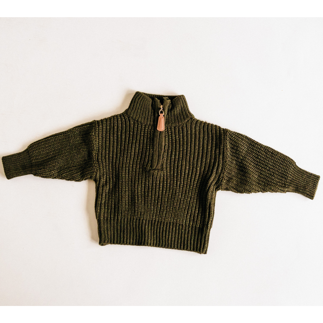 Are you a mommy looking for a matching outfit with your son or daughter, maybe even both!? These oversized dark green knit sweaters are IT! The women's fit is a comfortable loose fitting quarter zip with lantern sleeves, a brown leather zipper pull, and wide collar. These high quality sweaters are nice for family matching with your infant to older child. Coordinate your next family photoshoot with gender neutral family matching available with HAHA MAMA Clothing.