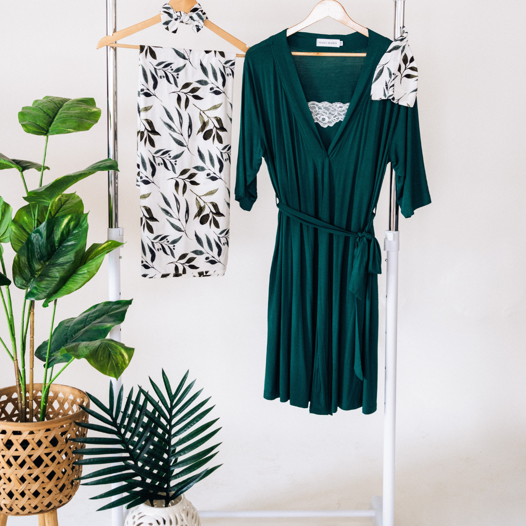 Emerald Green Maternity Delivery Gown & Leafy Vine Swaddle