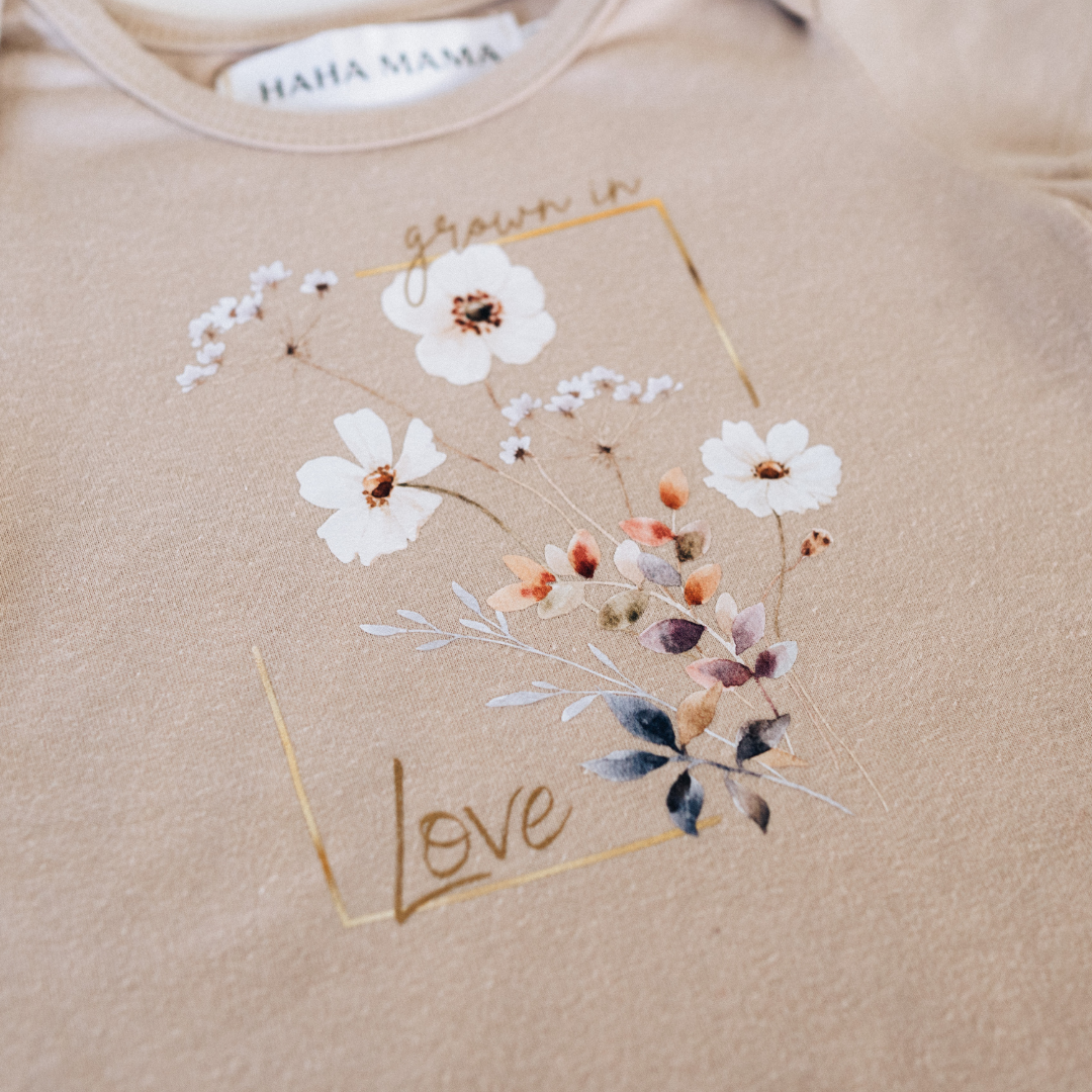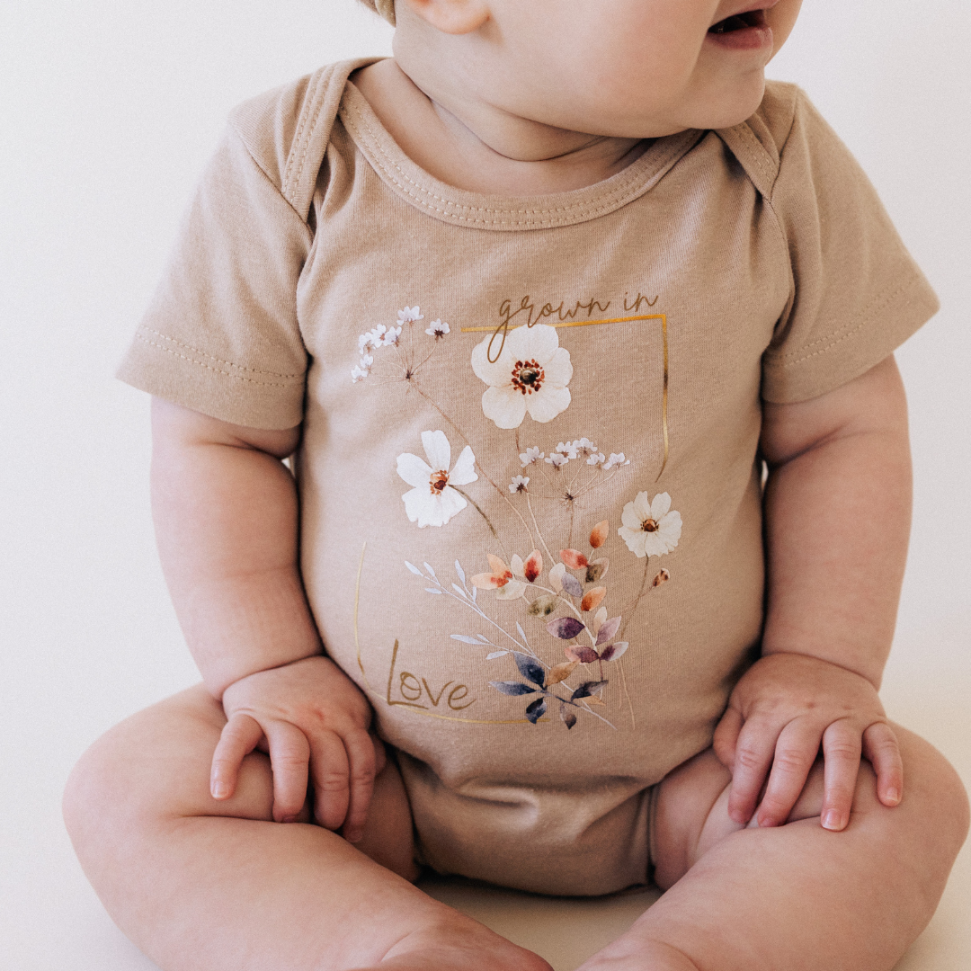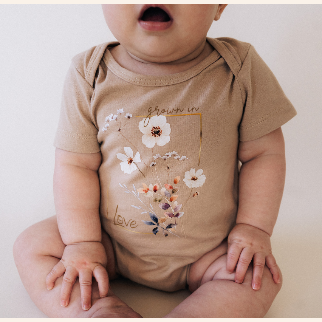 Grown in love! How perfect for your little girly. You will love the whimsical flowers and gold text that makes up the graphic on these onesies. Made with 95% cotton and 5% spandex for maximum comfort. Great for gifting to a new little wildflower at mama's baby shower or as a newborn gift. Don't forget to get the matching shirt for big sis!