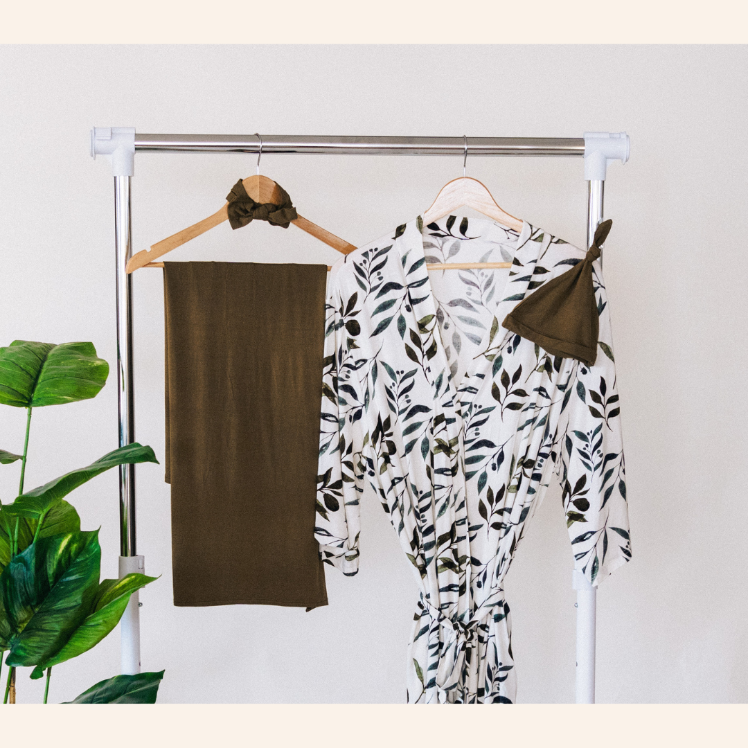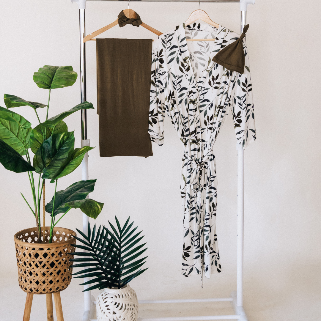 Leafy Vine Green Maternity Delivery Gown & Olive Green Swaddle