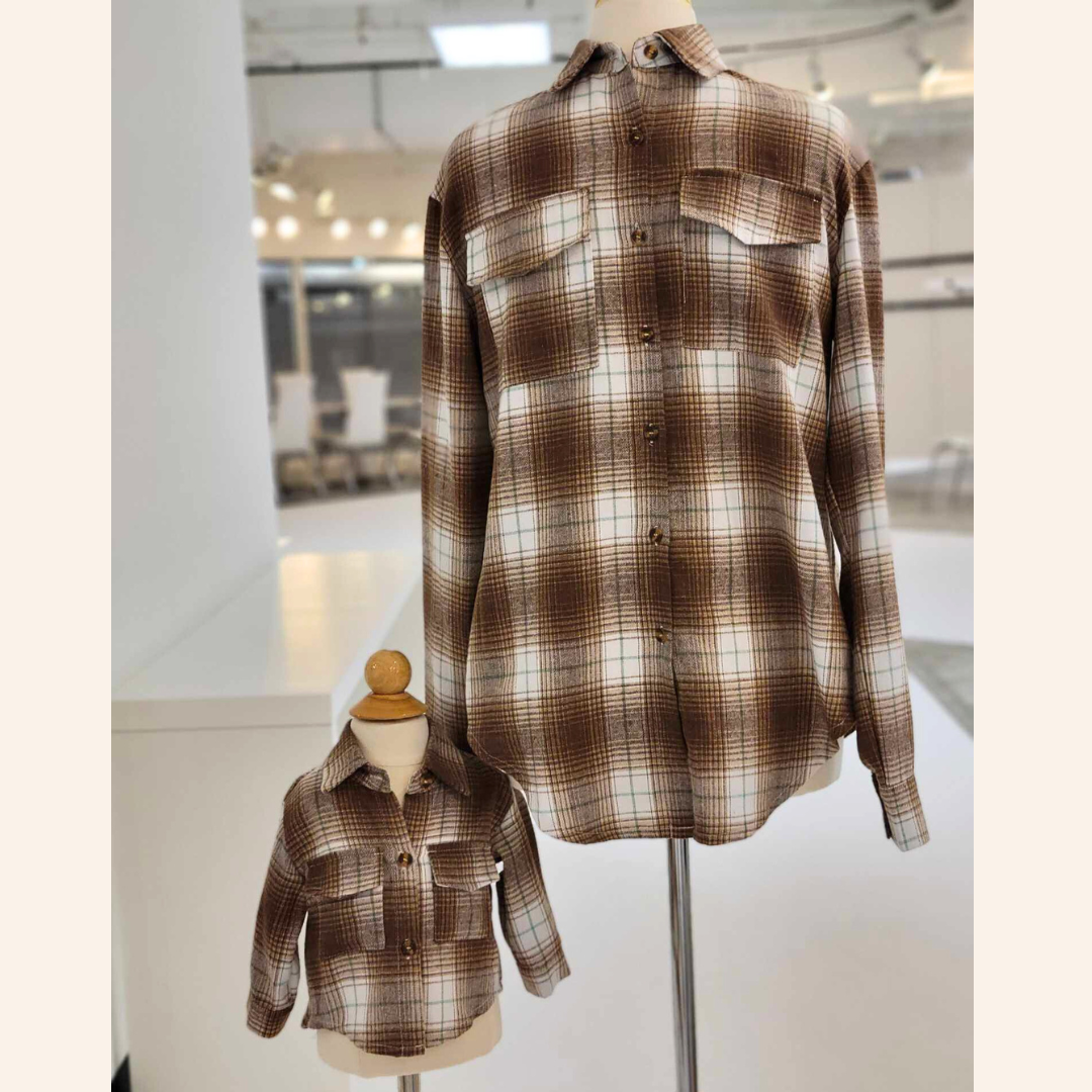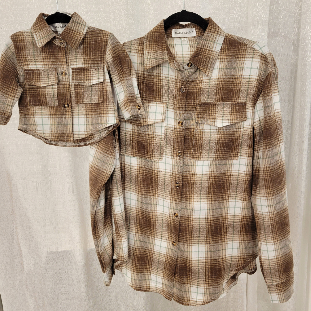 This lightweight plaid flannel shirt is the perfect blend of comfort, style, and versatility for both men and women. Made from soft, breathable cotton, it offers a relaxed fit that’s ideal for layering or wearing on its own. The classic plaid pattern adds a timeless, casual touch, while the lightweight fabric ensures you stay comfortable throughout the day, making it suitable for year-round wear. The colors are brown, tan, beige, and a streak of green. Matching with your little buddy makes these flannels all the more fun!