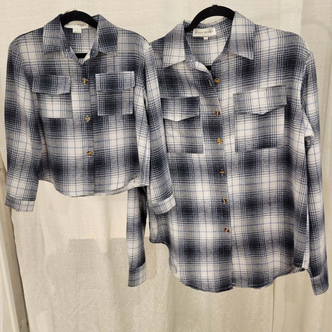 This lightweight navy plaid flannel shirt is the perfect blend of comfort, style, and versatility for both men and women. Made from soft, breathable cotton, it offers a relaxed fit that’s ideal for layering or wearing on its own. The classic navy plaid pattern adds a timeless, casual touch, while the lightweight fabric ensures you stay comfortable throughout the day, making it suitable for year-round wear. Matching with your little buddy makes these flannels all the more fun!