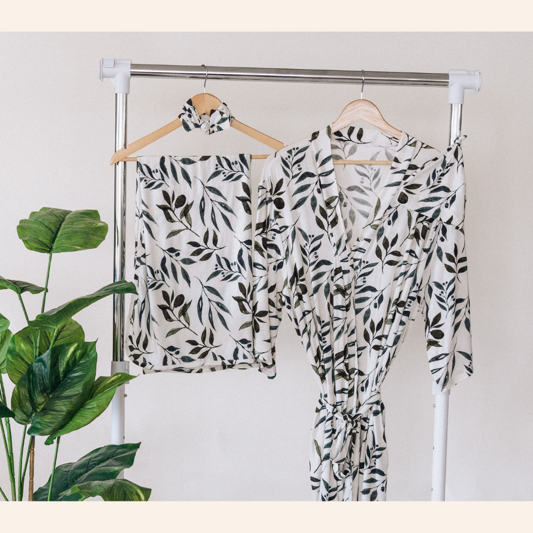 New mothers can now indulge in the luxury of a soft and silky robe that offers unmatched comfort while cuddling with their newborn. This inclusive set comprises of a belted robe with pockets in a gorgeous leafy vine print.