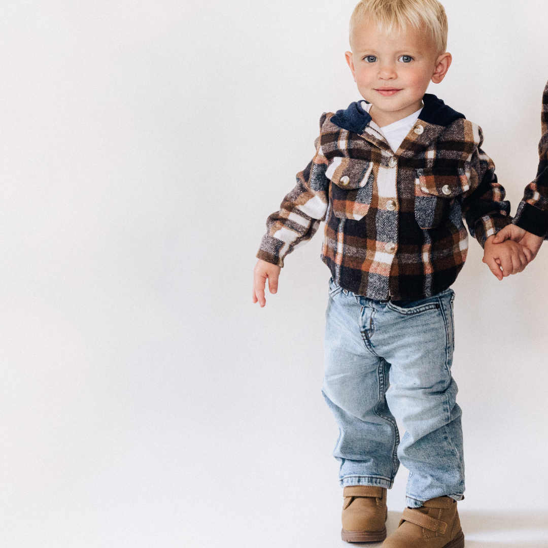 Flannels for a matching moment. Extra soft flannel material will ensure both warmth and style. The colors of brown, navy, white, and copper work seamlessly together. These sets have received the seal of approval from parents, are gender-neutral, and make an excellent gift for your little ones. The infant jackets fit true to size and the hood color is a deep navy.
