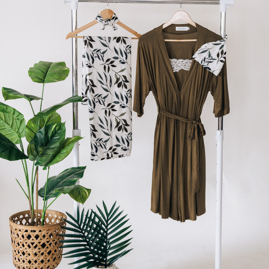 Olive Green Maternity Delivery Gown & Leafy Vine Swaddle