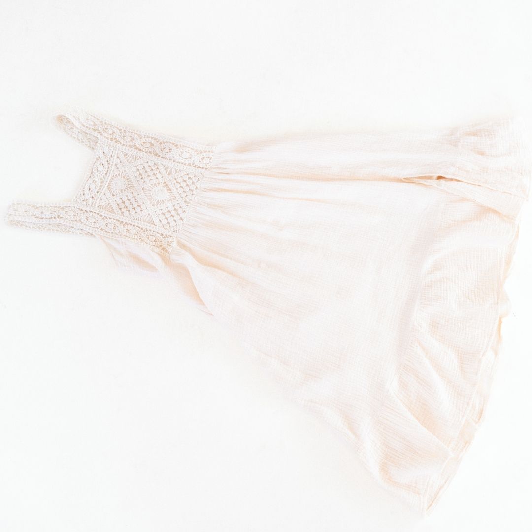 This lightweight cotton dress is great for any season and easy to layer. The lightweight cotton material is so comfy and airy. Mom's dress hits mid-calf with a stunning crochet bodice, pockets (bonus!), and beautiful crochet straps and a square neckline.