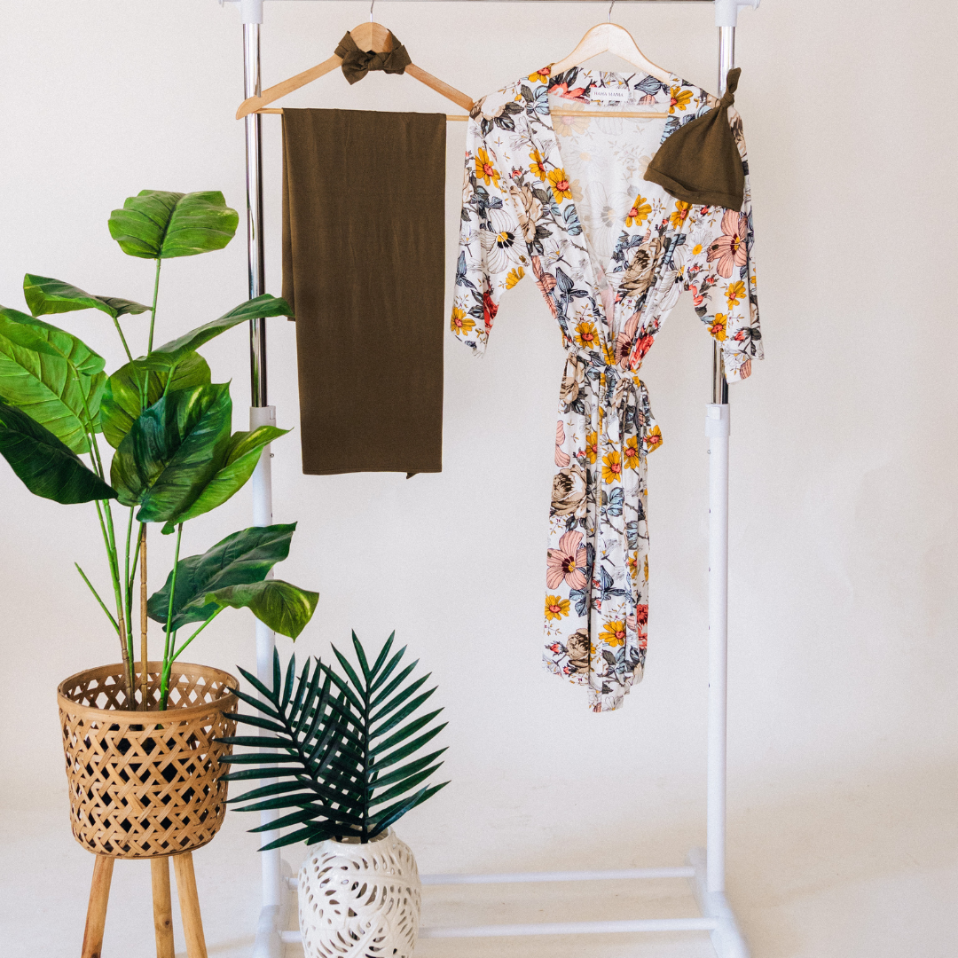 Vintage Floral Maternity Delivery Gown & Olive Green Swaddle